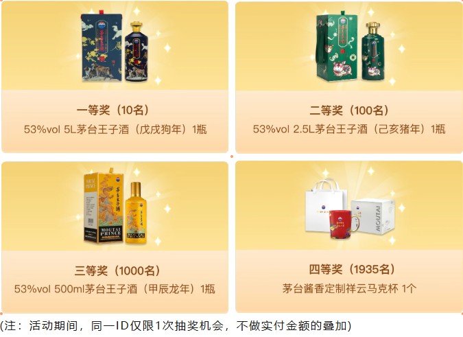 活動期間,親們在i茅臺APP購買上述四款活動產(chǎn)品,累計實付金額滿500元及以上,并在5月7日前確認(rèn)收貨,可參與抽獎活動,有機會抽取以下獎品: