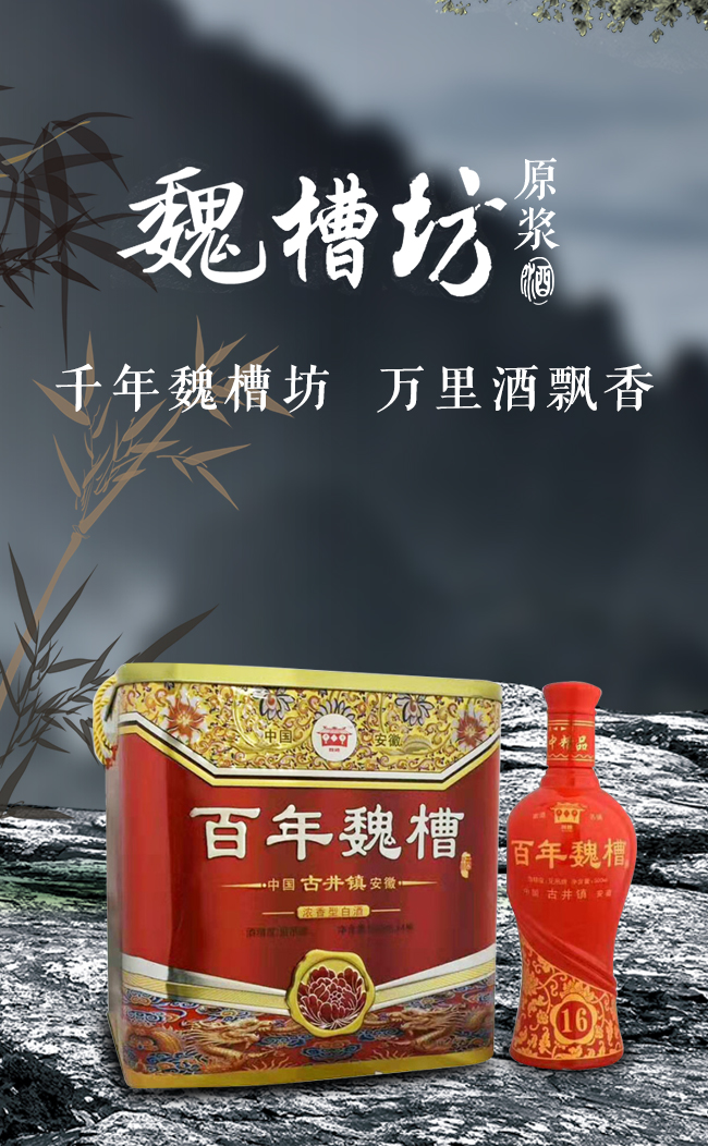 安徽魏槽坊酒業(yè)有限責(zé)任公司座落在華夏酒城安徽白酒之鄉(xiāng)——亳州市古井鎮(zhèn)。地處大京九鐵路沿線,自古以來,人杰地靈、物華天寶、資源豐富。公司釀造的白酒是通過“擇層取醅”、“擇時(shí)摘酒”等傳統(tǒng)技術(shù),得到精華的原漿美酒,再放入地下酒庫(kù)經(jīng)陶壇洞藏一定年限,使其自然老熟。