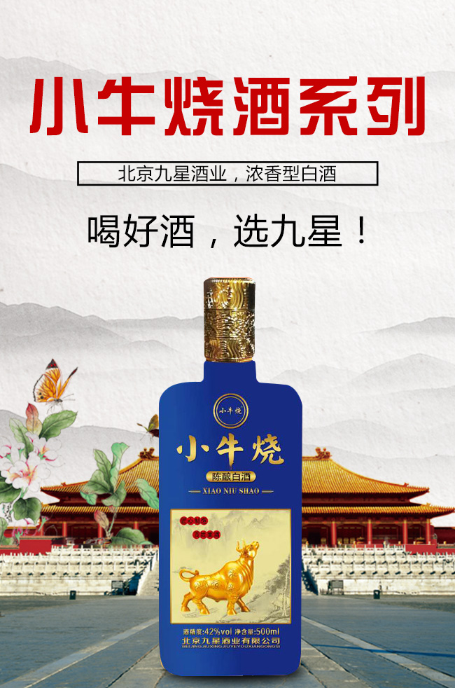 北京九星酒業(yè)有限公司是一家集產(chǎn)品研發(fā),生產(chǎn)銷(xiāo)售為一體的現(xiàn)代化白酒規(guī)模企業(yè)。目前開(kāi)發(fā)的主要是皇城門(mén)系列白酒產(chǎn)品。是以優(yōu)質(zhì)高粱為主要原料,用大麥、小麥、豌豆制成大曲,輔多種微生物為糖化酵劑,再經(jīng)過(guò)長(zhǎng)期發(fā)酵,緩慢蒸餾,取之精華,經(jīng)多年陳貯后,精心勾兌而成。以“清香幽雅,醇厚綿甜,尾昧爽凈”的獨(dú)特風(fēng)格,深受各界朋友的青睞。