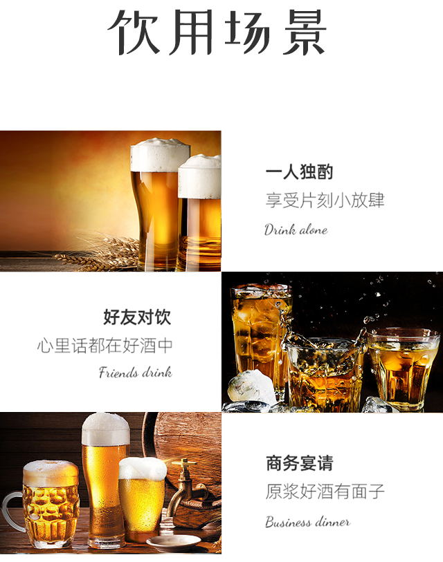 適飲場(chǎng)合:自斟自飲、家庭聚會(huì)、酒吧夜店、派對(duì)必備、燒烤擼串、野餐出游等
