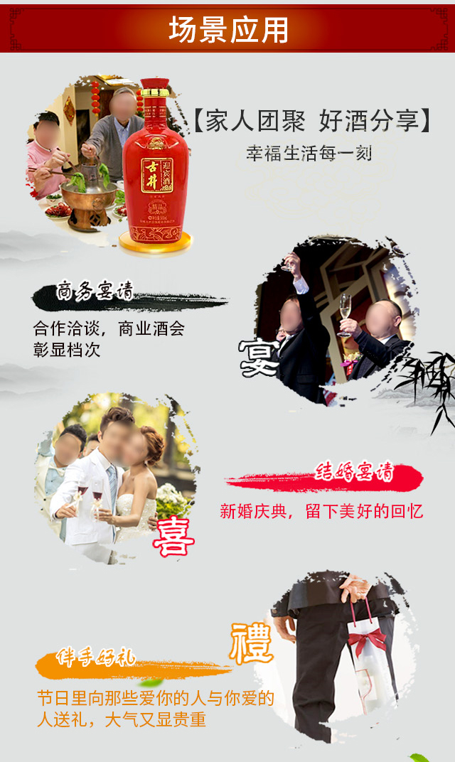 適飲場(chǎng)合:商務(wù)宴會(huì)、團(tuán)圓小酌、婚慶宴席、節(jié)日送禮、收藏等