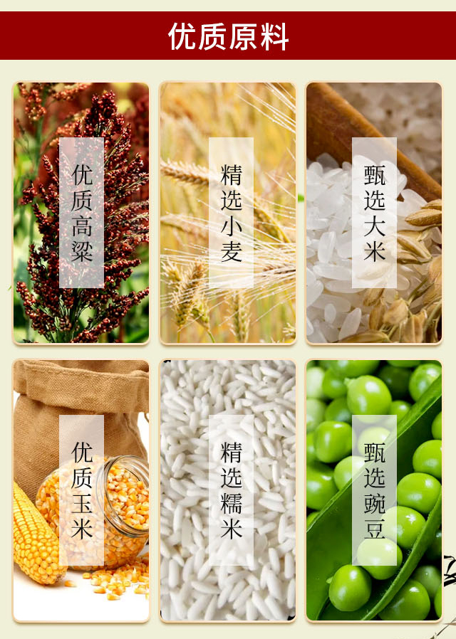 原料:高粱、大米、玉米、小麥、糯米、豌豆等