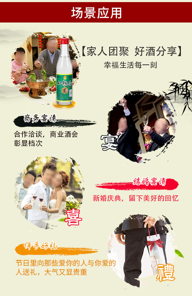 適飲場(chǎng)合:商務(wù)宴會(huì)、團(tuán)圓小酌、婚慶宴席、節(jié)日送禮、收藏