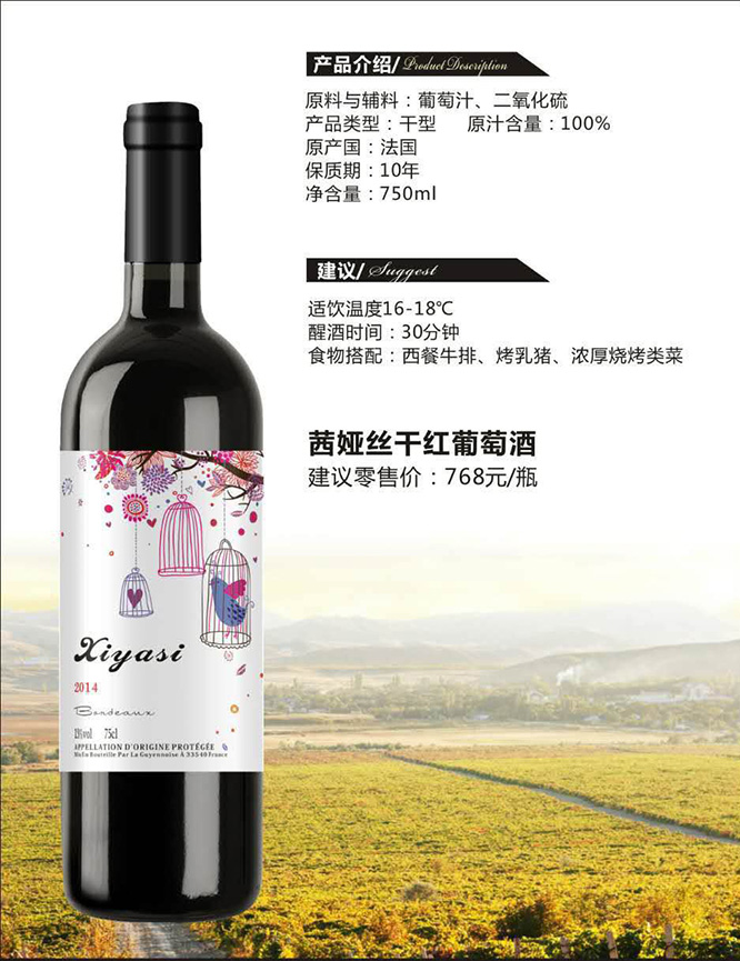產(chǎn)品名:茜婭絲干紅葡萄酒2014 13°750ml