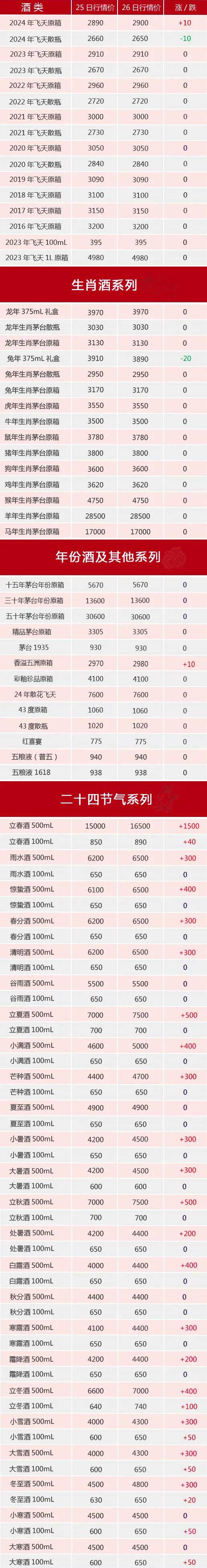 茅臺酒行情價:飛天方面,2024年原箱漲10元/瓶,2024年散瓶跌10元/瓶;生肖方面,兔年禮盒跌20元/瓶;其它系列,香溢五洲漲10元/瓶,多款大節(jié)氣酒漲200~1500元/瓶,多款小節(jié)氣酒漲20~100元/瓶。